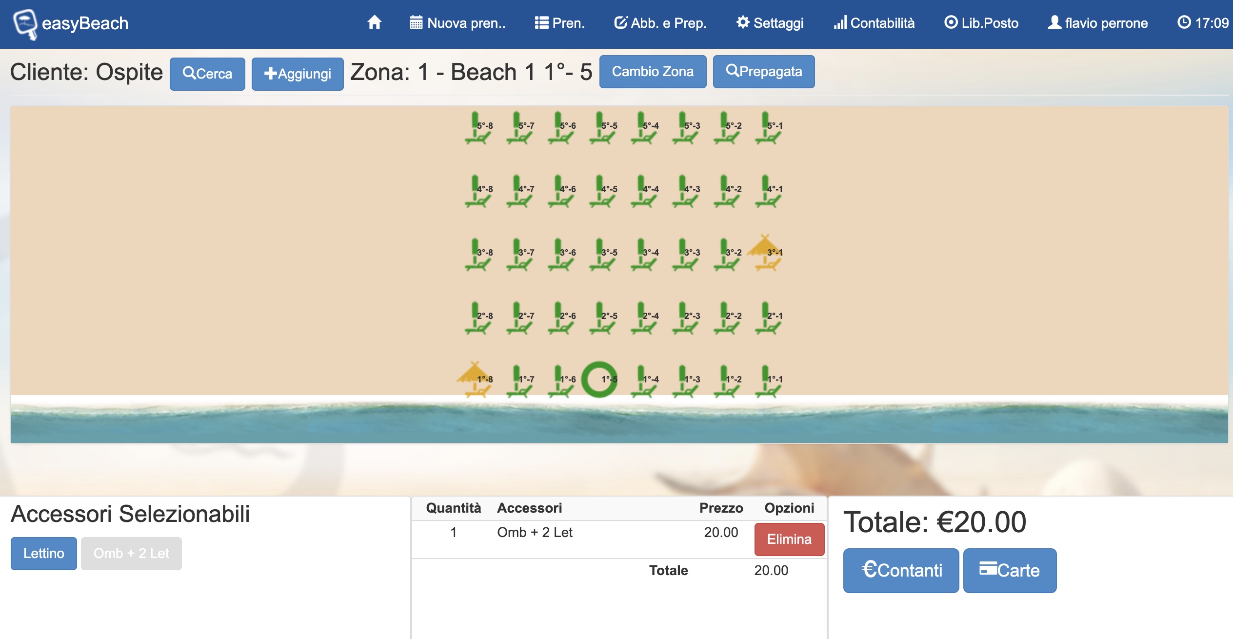 easyBeach ti permette di gestire qualsiasi tipo di vendita, riempiendo semplicemente i posti con la scelta degli accessori (ombrelloni, lettini, ecc.) per singola postazione.