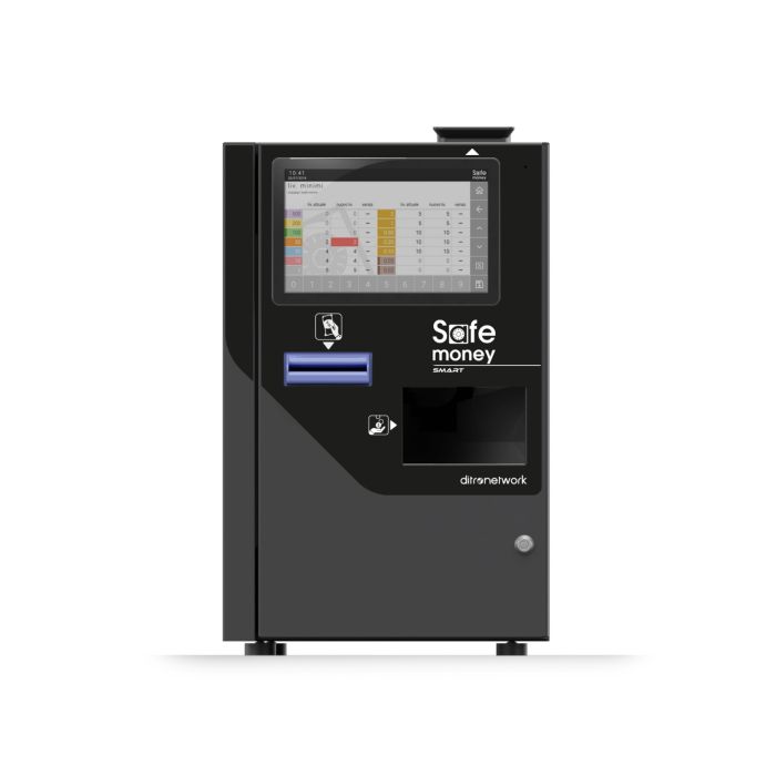 SafeMoney Smart presenta un design praticamente identico al modello Easy compreso il vano per alloggiare la stampante telematica e un nuovo modello di becchuccio per l’inserimento delle monete con l’aggiunta del monitor sulla parte frontale integrato allo sportello.